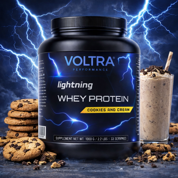 Voltra Performance Lightning Whey Protein Cookies & Cream is een hoogwaardige whey protein concentrate, ontwikkeld voor sporters die hun spierherstel en spieropbouw optimaal willen ondersteunen. Dankzij de snelle opname is deze eiwitshake ideaal na de training of als eiwitrijke aanvulling gedurende de dag.